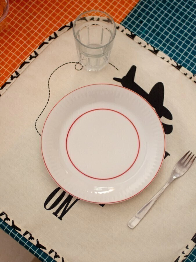 Individuales cuadrados de lona 100% algodón, con estampas en los bordes haciendo juego.